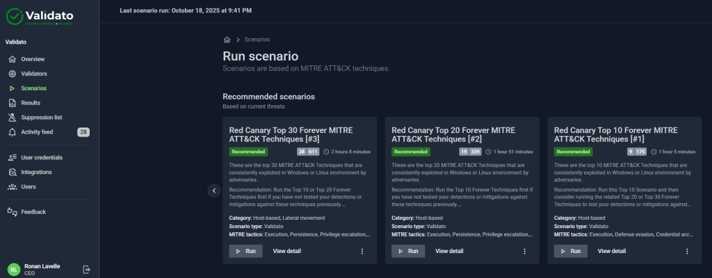 While it might seem like a lot of work to devise appropriate tests to validate detections and protective capabilities, you need not worry. Validato customers can run these Red Canary scenarios in just three mouse clicks.